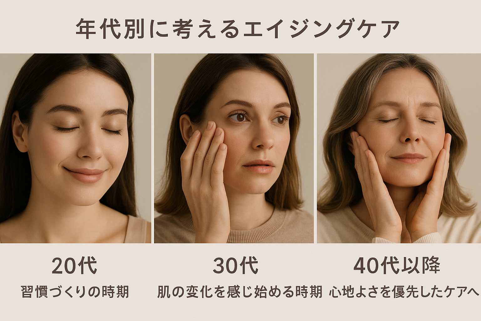 エイジングケアは年齢によって必要な意識が変わるわけではありませんが、年代ごとに感じやすい肌のサインは異なります。自分の肌状態に合わせて、無理なく取り入れることがポイントです。